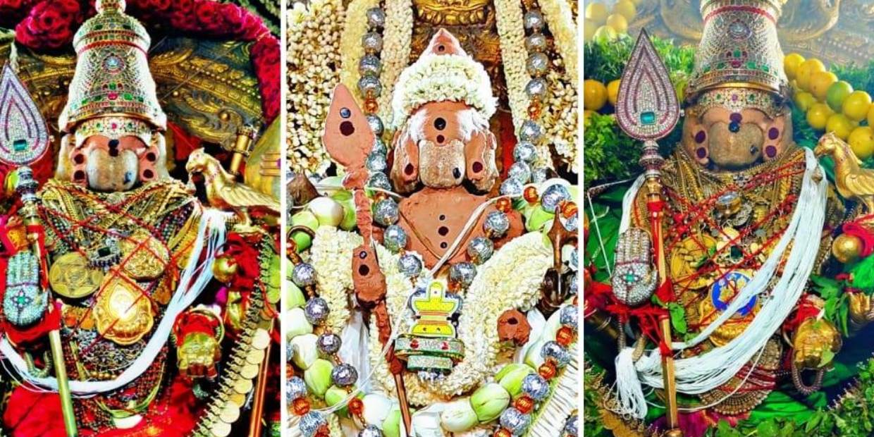 அதாவது பிரம்மா, விஷ்ணு, சிவனின் ரூபமாகவே அவர் நமக்குக் காட்சித் தருகிறார். ஆவணி, மாசி திருவிழாக்களில் 7 மற்றும் 8ம் நாள் ரொம்பவே விசேஷம். அன்று தான் சிவப்பு சாத்தி, வெள்ளை சாத்தி, பச்சை சாத்தி நடக்கிறது. சிவப்பு சாத்தின்னா எம்பெருமான் சிவபெருமானின் ரூபத்தில் முழு அலங்காரமும் சண்முகருக்கு சிவப்புல தான் இருக்கும். சிவப்பு மலர் என அலங்காரம் எல்லாம் சிவப்பாகவே இருக்கும்.